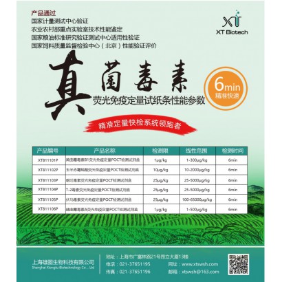 檢測結果準,產品線性范圍寬,檢測速度快(6min)、儀器操作簡單,一次樣品前處理可以檢測6種毒素(黃曲霉毒素B1、嘔吐毒素、玉米赤霉烯酮、伏馬毒素、赭曲霉毒素和T-2毒素),適用于糧食谷物及其深加工產品、飼料及其原料等樣品中真菌毒素的檢測,全國范圍內廠家上門安裝培訓,終身免費升級服務!