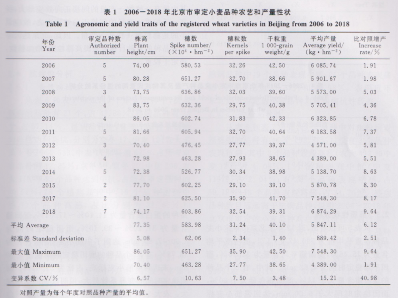 近年來,北京市審定了幾十個小麥品種,但對這些品種主要農藝性狀的演變規律少有研究。為此,本研究對2006- 2018 年北京市審定的49個冬小麥新品種的區域試驗數據進行了分析,以探究近13年北京市小麥產量及主要農藝性狀的演變規律,為北京市小麥新品種選育提供參考依據。