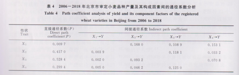 相關分析表明,穗粒數與產量的關系為密切,所有農藝性狀與產量的關系均呈正相關,這表明穗粒數是北京市小麥產量增加的主要因素。產量三要素對產量的直接通徑系數均為正值,對產量直接貢獻的大小依次為穗粒數>穗數>千粒重,與偏關分析得到的趨勢一致 ,這與孟麗梅等的研究結果不太一-致,這可能與研究對象和麥區生態環境不同以及旱地小麥少澆水有關。本研究發現,2006- 2018年北京市審定的冬小麥品種產量潛力的提高主要是因為穗粒數的提高,但是千粒重與穗數均與產量呈正相關關系。而張中州等認為,穗粒數是河南省小麥產量提高的制約因素,主要以增加單位面積穗數和千粒重來獲取高產,與本研究的結果不--致,這可能是研究對象不同造成的,本研究中主要以北京市冬小麥品種為研究對象,而前者是針對河南省半冬性小麥品種做的分析。偏相關分析和通徑分析結果均為正向效應,說明產量三要素比較協調,與溫輝芹等旱地小麥的表現一致。這說明在目前的栽培管理條件下,北京市選育的小麥品種主要是以增加穗粒數和單位面積穗數來獲取高產,這要求育種者在選育新品種時,要注意選育大穗與多穗型大群體小麥品種相結合,同時注意產量三要素的協調發展。