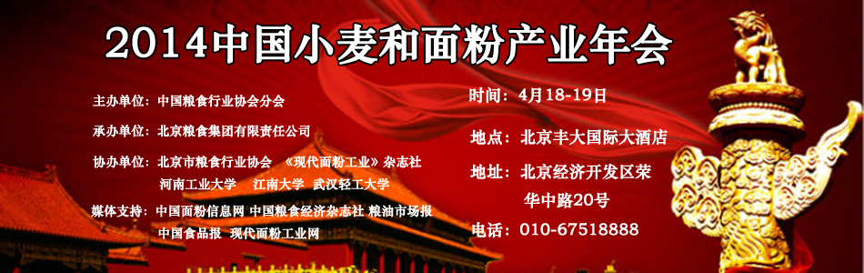 定于2014年4月17-19日在北京市召開2014年中國小麥和面粉產(chǎn)業(yè)年會(huì),主題是改革創(chuàng)新,轉(zhuǎn)型升級(jí),優(yōu)質(zhì)安全。會(huì)議期間將舉行小麥和面粉市場形勢(shì)分析、新技術(shù)新產(chǎn)品交流研討、電商時(shí)代下的小麥加工產(chǎn)品營銷、小麥制品及機(jī)械設(shè)備展示、主食產(chǎn)業(yè)化參觀等多項(xiàng)專業(yè)活動(dòng),并安排布置小麥粉及掛面示范加工企業(yè)和信用評(píng)價(jià)試點(diǎn)企業(yè)年審復(fù)評(píng)工作,組織編輯出版《2014年中國小麥和面粉產(chǎn)業(yè)年會(huì)論文集》。請(qǐng)各有關(guān)單位積極參會(huì)、參展 。更多... |
