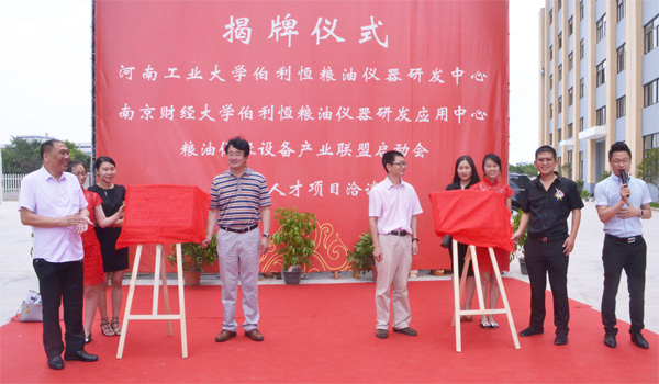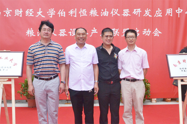 自左到右:河南工業大學糧油食品學院王曉曦院長,浙江伯利恒儀器設備有限公司林春生董事長、林新光總經理,南京財經大學食品科學與工程學院朱恩俊副院長 |