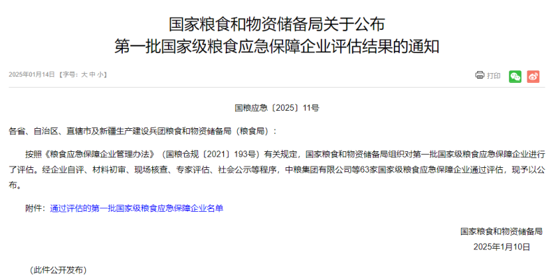 1月14日,國家糧食和物資儲備局公布第一批國家級糧食應(yīng)急保障企業(yè)評估結(jié)果,中糧集團(tuán)有限公司、中國儲備糧管理集團(tuán)有限公司等63家國家級糧食應(yīng)急保障企業(yè)通過評估,現(xiàn)予以公布。